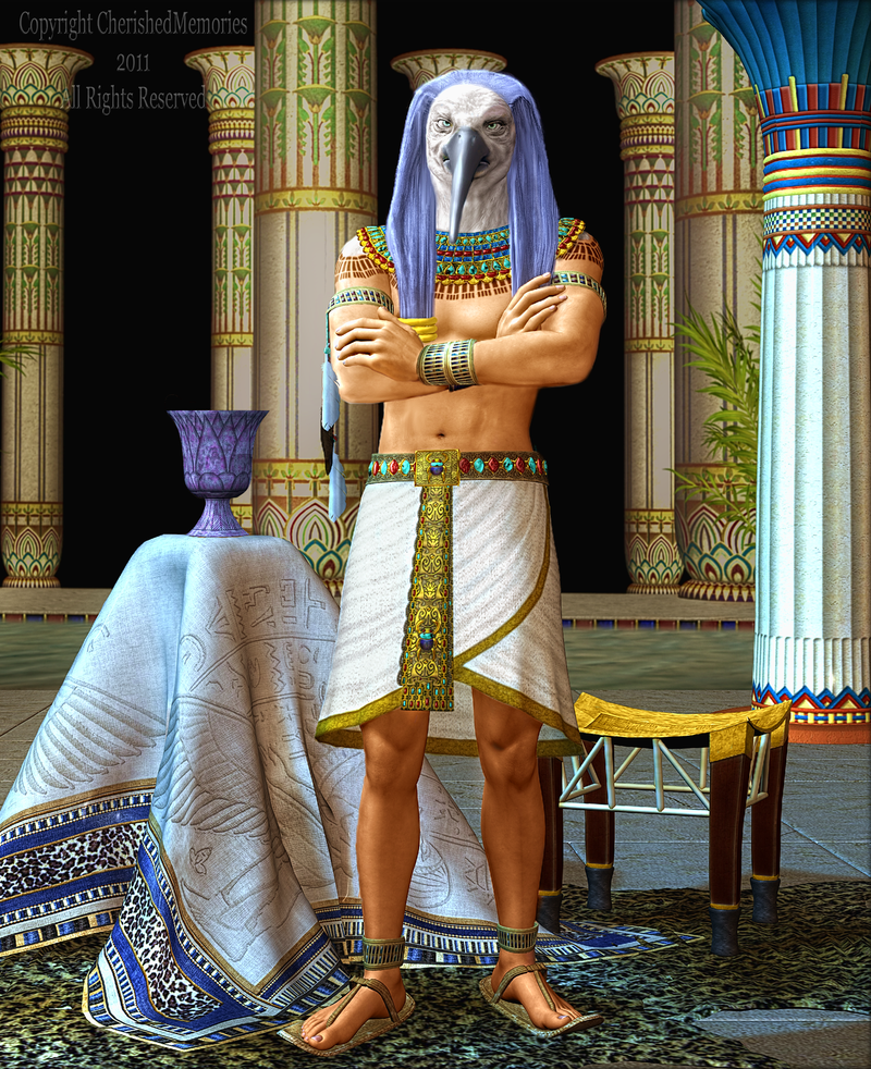 You step towards the massive wooden door, noting that there appear to be symbols etched in the wood. You take a moment to look more closely and note that they are Hieroglyphs and fade in and out of sight. You push firmly to open it and look into a space that is adorned with columns and sandy colored stone. Greeting you is a figure that is human and animal. His head is that of an Ibis and his body is strong holding the energy of the space in dominance and power.