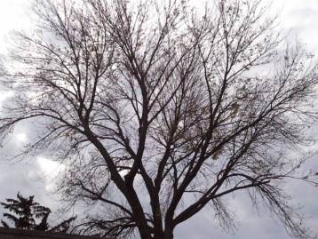 I looked up and was greeted by the beauty of a gently lit morning sky. The silhouette of a large tree that is on the lot seemed to have inked its way across the sky. The leaves had begun to turn and some were denser than others. The impression was one of serene beauty and massive power.